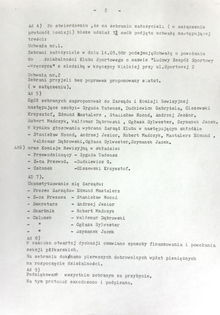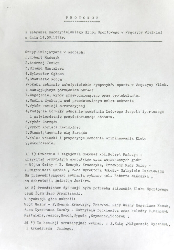 W 1998 roku grupa inicjatywna w składzie: Robert Mańczyk, Edmund Mastalerz, Stanisław Nocuń, Andrzej Jezior i Sylwester Ogłaza zwołała zebranie sympatyków sportu we Wręczycy. Ustalono na nim, że w ramach Ludowego Zespołu Sportowego Wręczyca powstanie nowa sekcja piłki nożnej. Wybrano również pierwszy zarząd. Przewodniczącym został Edmund Mastalerz, zastępcą Stanisław Nocoń, skarbnikiem Robert Mańczyk, a sekretarzem Andrzej Jezior. Członkami Zarządu zostali też: Waldemar Dąbrowski, Sylwester Ogłaza i Jacek Szymanek.